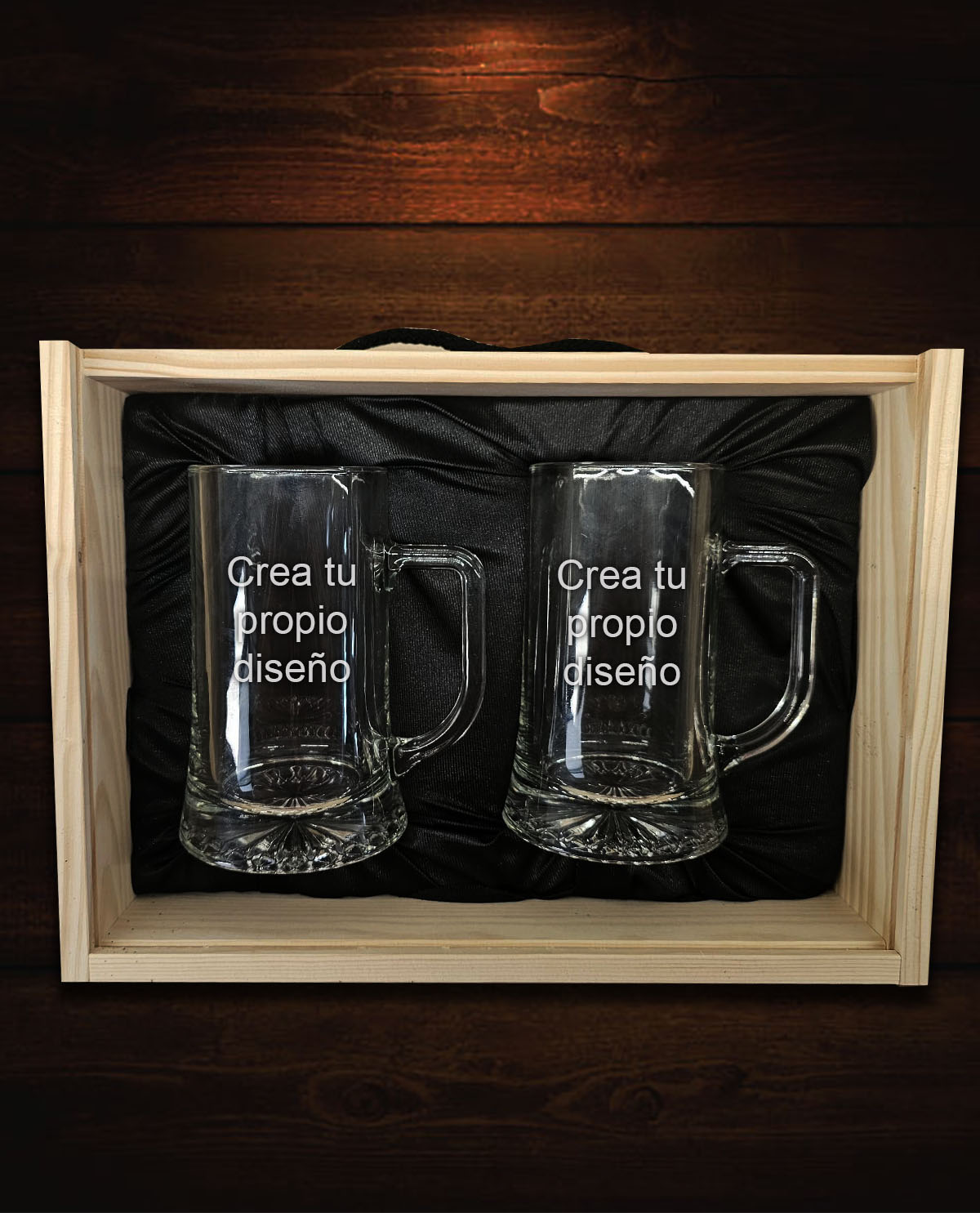 Fes que el teu regal sigui encara més especial amb el nostre Kit amb 2 Gerres de Cervesa Personalitzades en Caixa de Fusta. Personalitza tant les gerres com la caixa per crear un conjunt únic, ple d’estil i emoció, ideal per sorprendre en ocasions inoblidables.